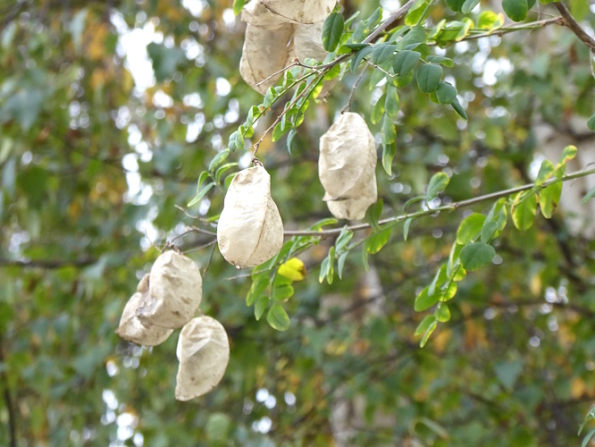 We know that very same shrub! We think it is a Bladder Senna, source of the famed “senna pods” to treat constipation, so not what you would recommend as edible! The real Siberian Pea Tree Caragana arborescens has seeds in slim, hanging red-brown pods, similar in size and shape to ordinary green beans, and not a bit like the puffy pods we saw. I think the one at Maghull station must be the Bladder Senna Colutea arborescens.