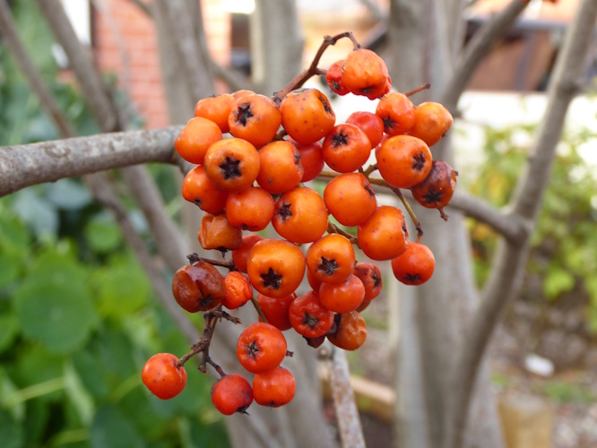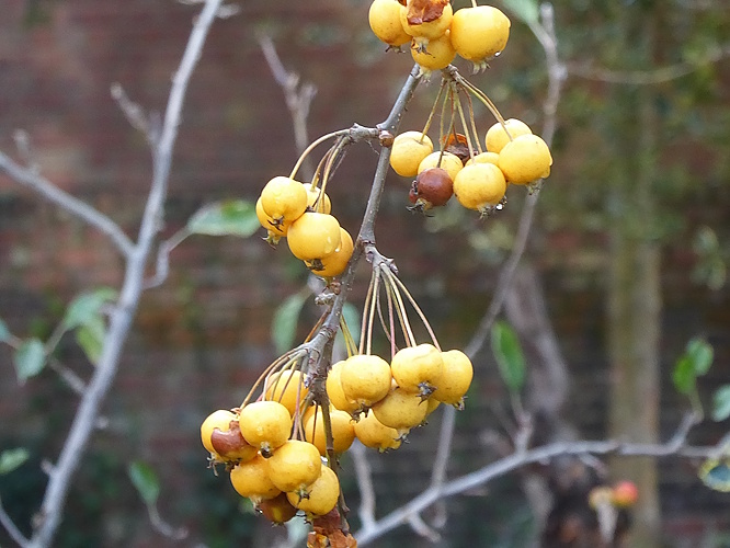 On the way back to the station we looked for flowering plants on the pavement and in front gardens. The winter-flowering shrubs Laurustinus and Jasmine were starting to bloom. In Sandlea Park there were no nuts left on the Almond tree, but there were Rowan berries and yellow Crab Apples remaining on the thinnest branches for birds agile enough to reach them.