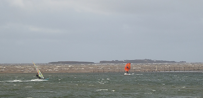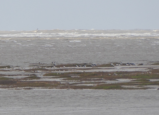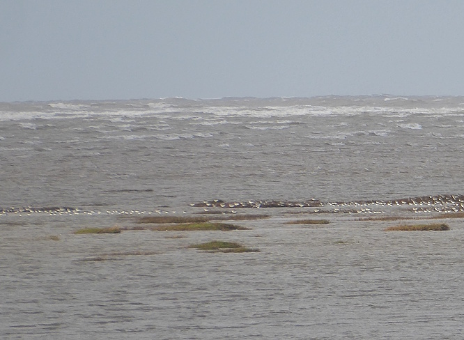 We headed back to the shelters in Victoria Gardens for lunch, narrowly missing a short hailstorm followed by clearing skies and a rainbow. Afterwards, we returned to Dee Lane.  From the railings by the beach we could see a row of birds taking refuge from the high tide on a spit of grassy sand. The black-and-white ones were Oystercatchers, while the grey-and-white ones were probably Knot.