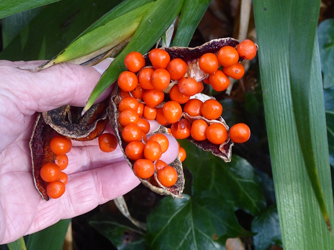On the edge of the path was a clump of Stinking Iris, whose seed pods had just broken open to reveal the bright orange fruit inside. All parts of this plant are poisonous.
