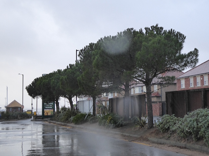 It was a really horrible, cold, wet and windy day. We had planned to go to Leasowe today, where there had been some rare winter visitors last week (Lapland Bunting, Snow Bunting), but they were long gone. We decided that West Kirby at least had some shelter. We were lashed with rain on the way from the station to the Dee Lane slipway, but despite the weather the row of five Stone Pines next to Morrison’s car park were still impressive.