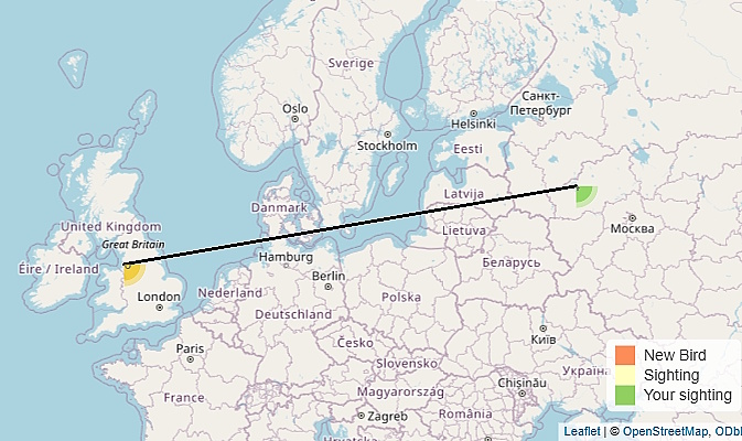 Bird 283K, the bolder one, was ringed at Ormskirk Coronation Park in November 2023 as adult. There have been 8 reports since then, all at the same pond, all in autumn or winter, but no indication of where it goes in the spring and summer. The shyer bird, much harder to lure out of the water, was 269E. It turned out to be a Russian spy! It was ringed as an adult at Coronation Park in December 2022. Of the 19 reports since then, three were from a place called Ostashkov, Russia, probably its place of hatching, about half way between Moscow and St Petersburg. It was recorded there in April 2023 and in May, June and July 2025. All the other autumn and winter sightings were at Coronation Park, Ormskirk.