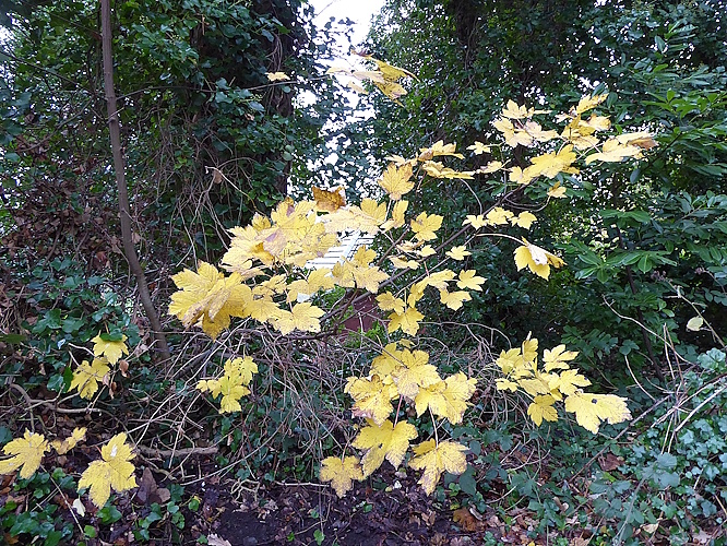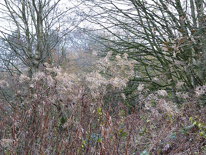 High up in the bare trees parties of mixed tits, Blue, Great and Long-tailed, were passing through. We saw a Blackbird on path, a Wood Pigeon in flight overhead, two Jays and a fleeting glance of a Great Spotted Woodpecker. We walked a little way up the “Smith Way”, originally a horse track. In WWI Ormskirk Station was a gathering place for thousands of requisitioned and purchased horses, which were walked along this path to the remount depot at Lathom Park. Against the dark background of wet hedges, there were occasional splashes of gold, like this Norway Maple, still holding on to its autumn leaves.