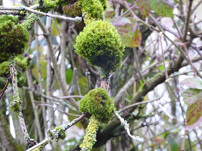 It was very damp and drippy under the trees. Some moss on a tree caught my eye, growing not as a carpet, but as small “blobs” about 1 – 2 cm (half an inch) across. Never seen that before. It might be Wood Bristle-Moss, described on the website of the British Bryological Society as “by far the commonest species of its genus, Lewinskya affinis characteristically grows epiphytically as small, loose tufts 1-2cm tall on the bark of a wide range of trees and shrubs.” It’s common and widespread and an indicator of clean air.