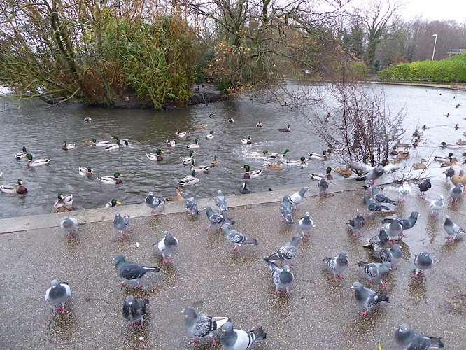 At Victoria Park on the corner of Ruff Lane, where we ate lunch in a fine rain, we watched a pair of Blackbirds and a Song Thrush dodging about on the lawn. Then we walked via Morrisons supermarket to the much bigger Coronation Park. By their Duck Pond they have a sign claiming to be visited by a Heron, Swans, Canadas, and Swallows in the summer, but today there were only Pigeons, Mallards, Coot and Moorhen, all hungry for bread.
