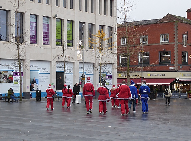We seem to have had a lot of wet Sundays recently, and here’s another one. It was dry when I arrived in town, and all the costumed runners were making their way through the city to join the 5 Km “Santa dash” from the Pier Head to the Town Hall. A record 11,000 took part this year, making it the largest in the UK.
