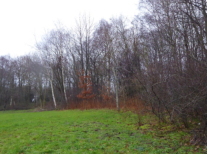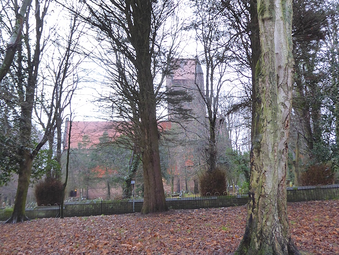 We are having a disproportionate number of wet Sundays this autumn, and this was yet another soaker. It was our last Sunday walk of the year, and we were in Kirkby, planning to visit a friend later. We started at St Chad’s church, which has a little park in front of it, and then we walked all around the church to check the belfry, where Peregrines nest most years. Nothing to see today.  Then we set off northwards through a green space called Millbrook Millennium Green.