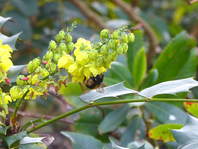 Just inside Ashton Park was a Mahonia in a patch of sunshine, just starting to flower. The scent of its nectar had attracted several Bumblebees, almost certainly queen Buff-tailed, Bombus terrestris, as they are said to emerge from hibernation first, sometimes as early as mid-February.