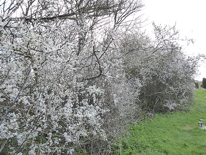 The east and south sides of Landican Cemetery border on horse pastures, so despite being near to the Woodchurch estate and Arrowe Park Hospital, there are still countryside birds and mammals there. Brown Hares are known to creep in and we have occasionally seen them. During our walk we looked out over those pastures from time to time, but we saw no Hares. However, we heard a Cock Pheasant calling and John spotted a Grey Partridge scurrying away into a dip. The first Cow Parsley was just showing some straggly flowers and the Blackthorn hedge was still white.