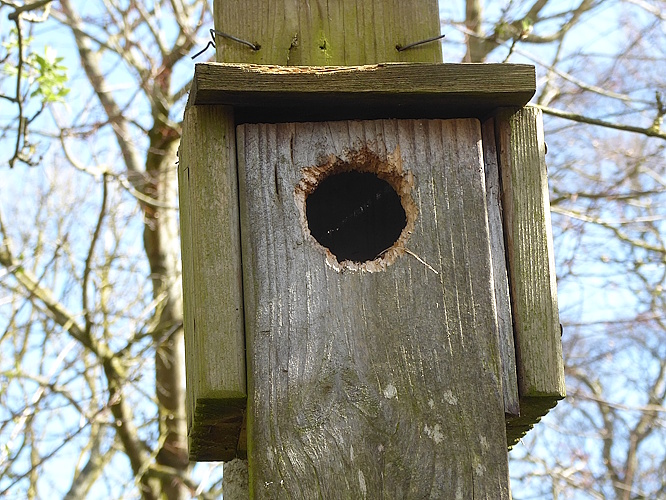 In the wild area near the south-east corner we noted a predated nest box, which looked like it has been gnawed by a Squirrel.